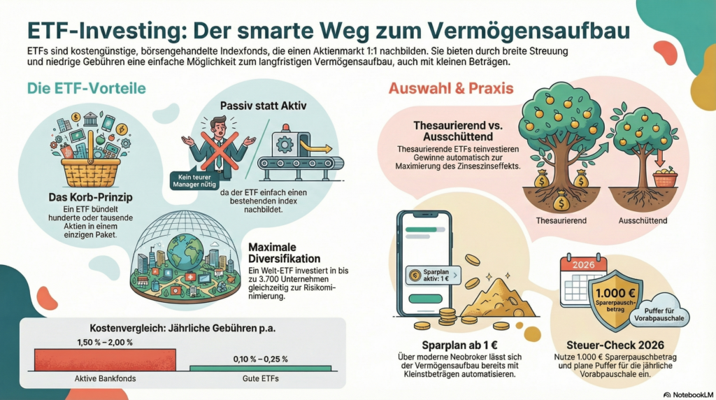 ETF-Wissen kompakt: Dein Fundament für den Vermögensaufbau: Warum kompliziert, wenn es auch smart geht? Entdecke in unserer Infografik, wie du mit ETFs breit gestreut und kosteneffizient investierst. In nur wenigen Minuten verstehst du die wichtigsten Basics- vom Korb-Prinzip bis zum Zinseszins-Turbo.
